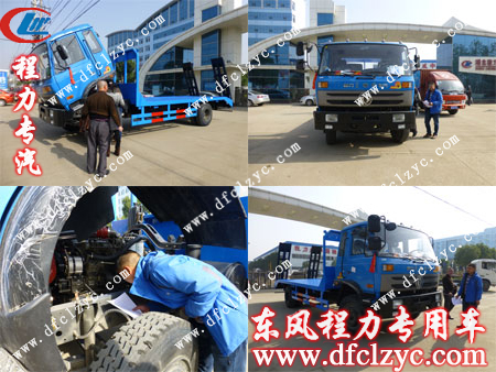 湖北程力专用汽车有限公司东风153平板运输车整车尺寸8990×2500×2770MM,平板可用尺寸约6.7米,横梁采用100×100×5MM国标方钢,间距300MM,面板采用5MM厚花纹板,板面焊多根16的螺旋钢,尾部带双弹簧爬梯,支腿2个.