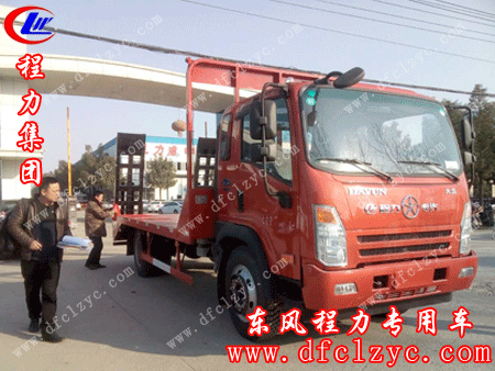来自上海孟总在程力集团购买一台大运平板运输车,大运公司原装底盘,底盘型号:CGC1140HDE4E,发动机型号:YNF40E1,170马力,4.1米轴距,云内柴油环保发动机,国五排放标准,8.25R20钢丝胎。平板采用5MM厚国际花纹板,前轮可转向,在施工道理不平情况下,能保持所有轮胎同时着地,保证车架和轮胎受力均衡,确保所载设备安全等。
