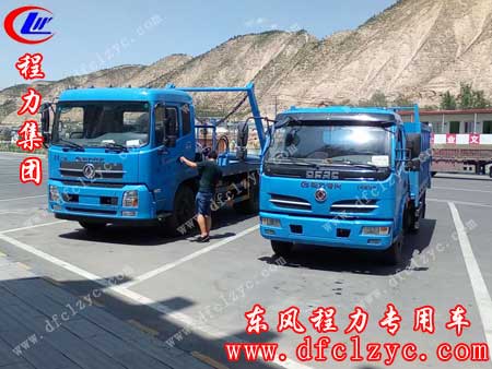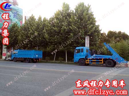 摆臂式垃圾车的特点是垃圾箱与车体分开,实现一车与多个垃圾箱的联合使用,循环运输。货斗有方形和船形,方形用于地坑式,船形置于地面,充分提高了车辆的运输能力,特别适用于短途运输。自卸式垃圾车可方便收集垃圾,垃圾厢体电动液压自卸,倾卸垃圾方便,密封性能好,广泛适用于城市街道学校垃圾收集。下图就为湖北程力东风天锦摆臂式垃圾车和东风自卸式垃圾车图片
