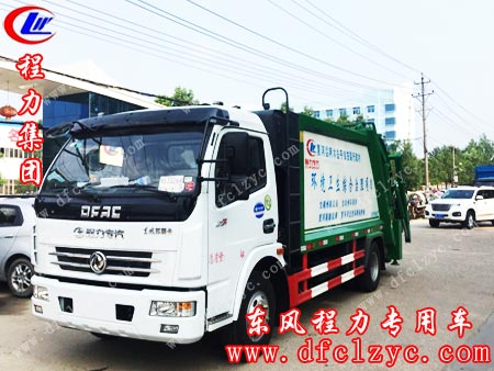 东风大多利卡压缩式垃圾车,东风公司原装底盘,底盘型号:EQ1080SJ8BDF,东风朝阳朝柴发动机,156马力,国五排放标准,带方向助力,厢体采用约4MM优质钢材制作,采用PCL电控系统,垃圾箱容积约8立方。根具客户要求:尾部加装后摆臂机构,含一个摆臂斗,摆臂斗容积约3m³,加装空调。