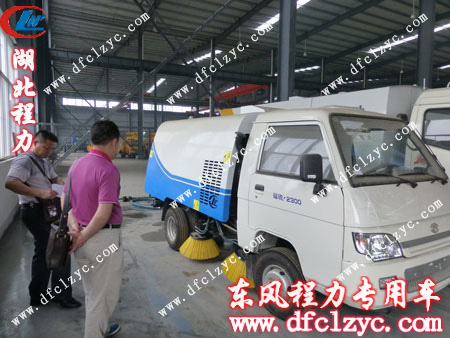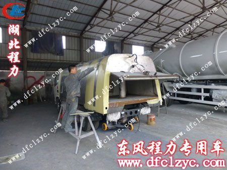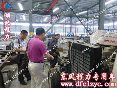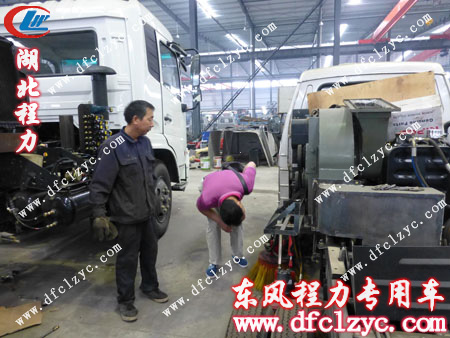 客户在油漆车间观看正准备做油漆的东风小霸王扫路车