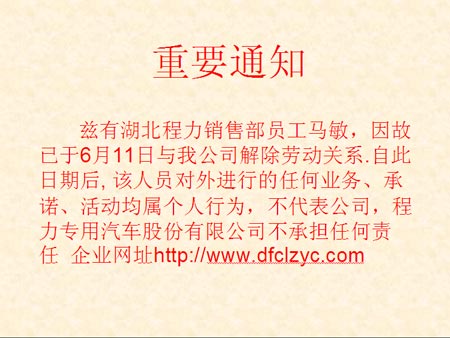 兹有湖北程力销售部员工马敏,因故已于6月11日与我公司解除劳动关系.自此日期后, 该人员对外进行的任何业务、承诺、活动均属个人行为,不代表公司,程力专用汽车股份有限公司不承担任何责任。此前由其负责的与贵公司相关工作现由我公司在职人员王琼负责,联系电话:18771331899,其将会及时跟贵公司联系。给贵公司带来的不便之处敬请谅解。