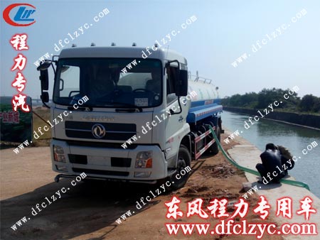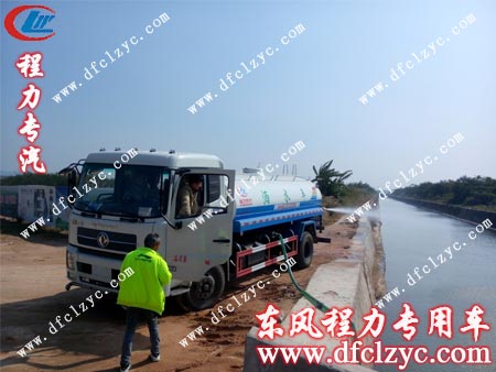 湖北程力东风天锦洒水车与订购公司师傅一起试车,在自然取水处,我程力公司生产洒水车采用的是自吸功能进行取水,该洒水车出厂自带两根约7米的吸水管,可以随时随地进行吸水作业。