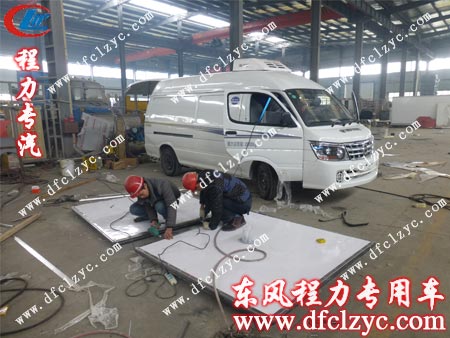 现成的金杯冷藏车底盘,进入生产车间,预计两天后厢体安装完成,下一步安装制冷机组、调试,办理出厂手续及发票,之后便是送车了。