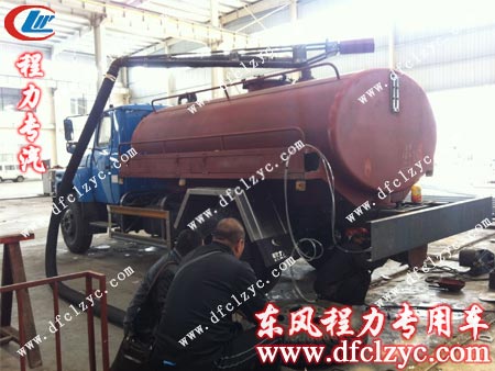 湖北程力生产车间另一边一台东风小多利卡吸粪车安装也正在悄然进行着。两台吸粪车对比,该小吨位吸粪车是按常规配置生产的,另一台东风140吸粪车是根据用户要求进行改装自流口下置。