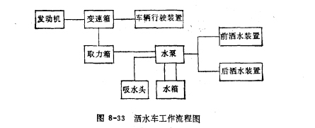 洒水部分由取力箱、水泵、皮带传动、水箱、管路、阀门及洒水喷头等组成。如图8-32所示。
