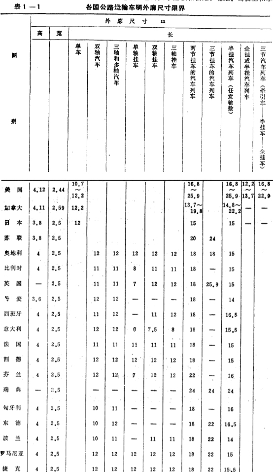 外廓尺寸系指汽车的总长、总宽和总高。它的大小直接和轴距、轮距、驾驶室和车身的布置有关,可根据汽车的功能、吨位、容量、外型设计、专用设备、结构布置、使用条件和使用情况等因素确定。总体设计时在满足吨位和容载量的情况下,应力求减少外廓尺寸,以减轻汽车的自重,提高汽车的动力性、经济性和机动性。但是,公路运输专用汽车的外廓尺寸受公路宽度、公路弯道半径、桥梁,涵洞以及铁路运输货物尺寸标准限制。为此各国对公路运输车辆的外廓尺寸均有法规限制。我国公路车辆的限界尺寸规定总宽不大于2.5m,总高不大于4m,货车总长大于12m,半挂车不大于16m,汽车拖带挂车不大于20m。表1一1列出各国公路运输车辆的外廓尺寸限界位。