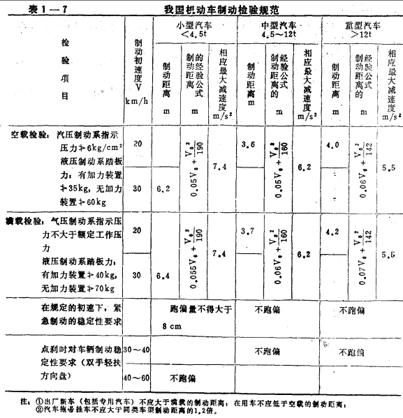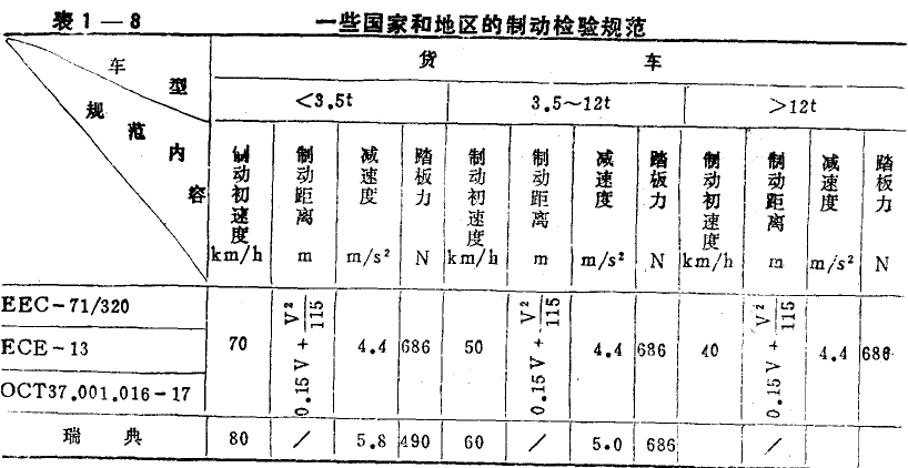 为保证交通安全,许多国家制定有汽车制动法规,这些法规对汽车设计和汽车性能有着重要影响。表1一7为我国机动车制动检验规范;表1一8列出一些国家和地区的制动检验规范。