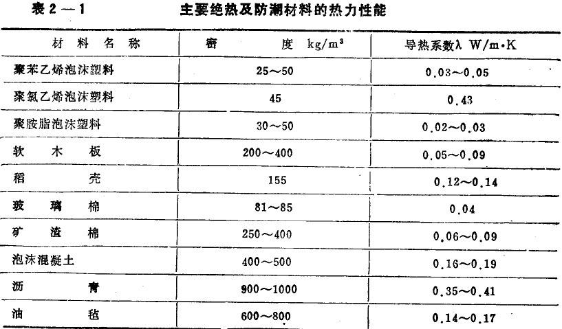 表2一1列出主要绝热材料及防潮材料的热力性能。
