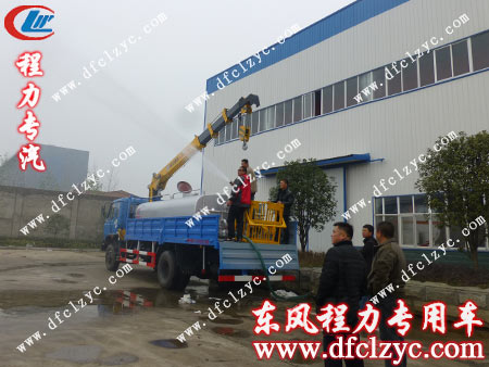 客户首先将该辆东风153随车吊带洒水车全方位的检查了一遍,上到车厢上仔细的观察了吊机和吊篮,各出水口的阀门,一边看一边向工作人员询问,看来这位客户对专用车辆是有一定的了解的。