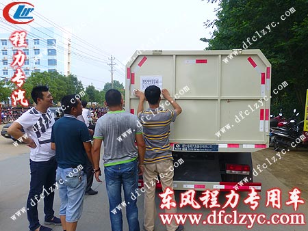 试完车,开始为东风锐铃挂桶式垃圾车能顺利的在路上行驶做准备了,上图是客户为东风锐铃垃圾车贴上临牌,确保新买车辆能正常在路上行驶。