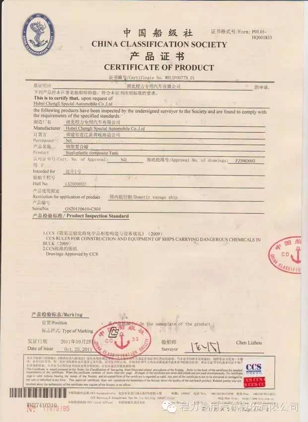 同时湖北程力专用汽车有限公司还有船用衬塑罐已获中国船级社认证