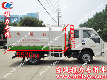 湖北程力福田3000挂桶垃圾车外形小巧,其整车尺寸为:5530×1870×2380mm。