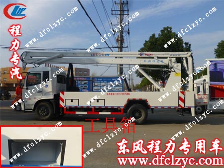 程力专用汽车股份有限公司从细小的地方做起,让用户感受到我们的精益求精,东风天锦高空作业车带两个工具箱,解决了用户无处存放工具的难题。