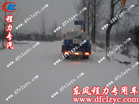 东风凯普特高空作业车和东风多利卡洒水车从随州出发时已是大雪纷飞,路面已有厚厚的积雪,湖北程力集团送出司机不惧艰险,行驶的步伐异常坚毅。