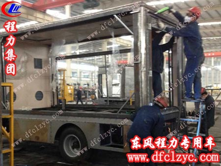 然后就是把基本的框体缓缓的吊上底盘,进一步组装福田康瑞H2LED广告宣传车的厢体,湖北程力生产的LED广告宣传车的厢体采用的是复合钢架,内置木质内饰铝花纹板。