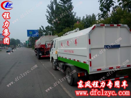 东风后双桥洒水车行驶到安徽境内时偶遇了湖北程力集团福田时代挂桶式垃圾车,有缘千里来相会,这下行车旅程不孤单了。